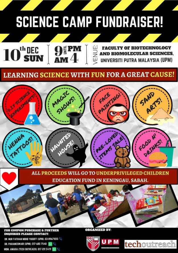 Science Camp Fundraiser on 10.12.2017 TECH NewsBy adminDecember 3, 2017Leave a comment Fun Science and Recreational games to try! Organised by Faculty of Biotechnology, UPM. All proceeds go to underprivileged children in Keningau, Sabah.